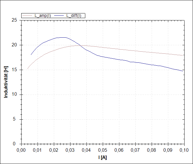 Auch hier ist der typische Verlauf wie bei den üblichen eisenbasierenden Kernwerkstoffen zu sehen. Die Anfangsinduktivität ist aufgrund der Magnetisierungskennlinie mit ihrer niedrigen Anfangspermeabilität erheblich niedriger als die Induktivität bei Nennstrom. Eine Kleinsignal-Messung ergibt hier irreführende und nicht reproduzierbare Ergebnisse, die zu klein sind.