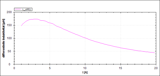 Die Induktivität liegt bei diesem Exemplar über den gesamten Bereich über der nominalen Induktivität. Nur mit einer Kleinsignalmessung ergibt sich eine Induktivität im Bereich der Herstellerangabe von etwa 71 µH. Von diesem Wert aus steigt die Induktivität fast auf den 2,5-fachen Wert an. Anschließend fällt die Induktivität wieder ab. Der Nennstrom gibt in diesem Fall nur die thermischen Grenzen der Drossel an.