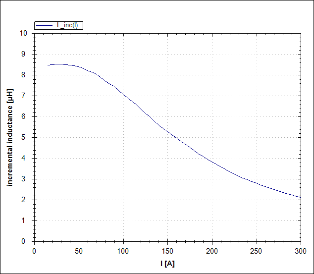 The typical slope of the saturation profile of this core is very easy to discern. However, because this core material is very expensive, an optimal economic solution requires that the operational point at rated current lies beneath the level of initial inductance.