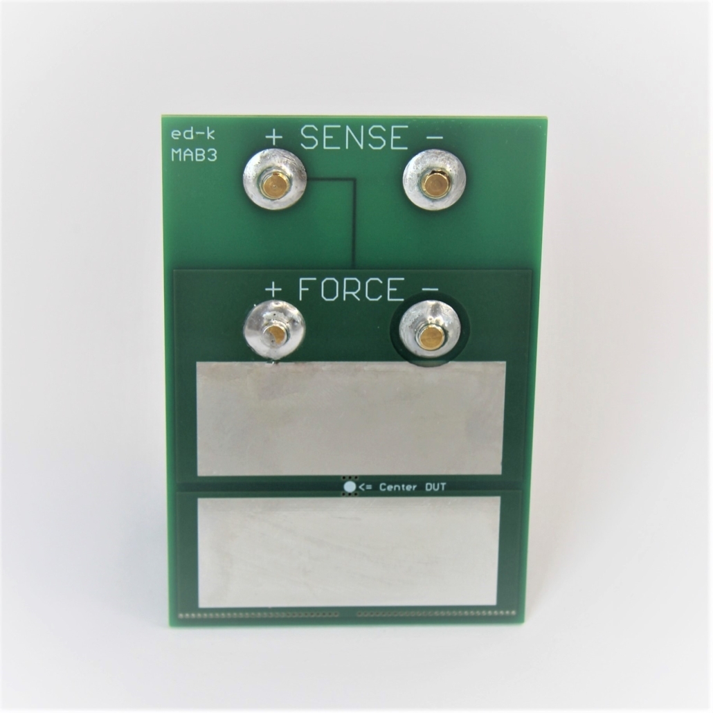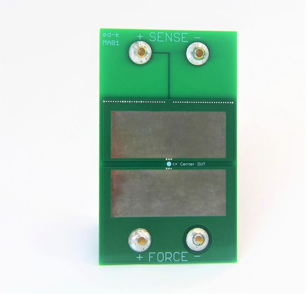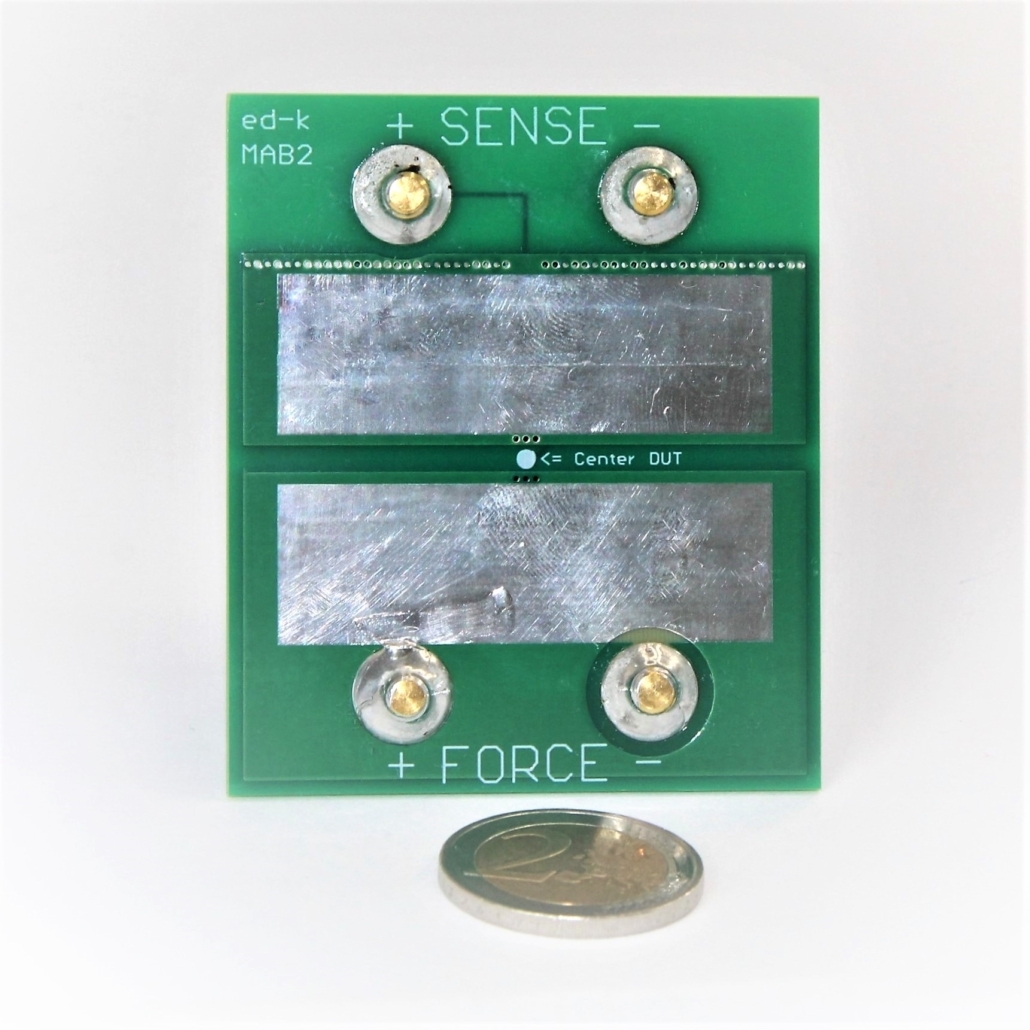 Therefore, we developed test adapters for measuring low-inductance components some time ago. SMD components and also through-hole components can be soldered directly onto these MAB1, MAB2, and MAB3 test adapters, which are then plugged directly into the sockets on the front panel.