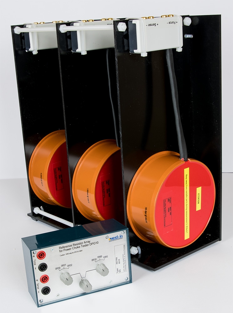 At each calibration we open the devices and subject them to a thorough visual inspection. We also check the function of internal safety devices and circuits. For the factory calibration, we use specially developed, self-made inductance standards, which meet the special requirements through the pulse measurement procedure of our devices. Other inductance standards commonly used in calibration laboratories are usually unsuitable because they are neither designed for high pulse currents nor have sufficient frequency response. Since our devices can also operate with very short pulse times of <3 μs, the frequency response of the ohmic resistance is also important for the precision of the inductance measurement. For customers from overseas, we offer a calibration kit including calibration instructions, which can be used to perform the calibration either by itself or by a local calibration laboratory. It contains three long-term stable, very accurate inductance standards (100 μH, 1 mH, 10 mH) in the ABS / PA rack, a low impedance switchable resistor array (6 values from 10 mΩ to 10 Ω, < 0,08%, TK < 20ppm) and a test lead set. For the model DPG10-100B, DPG10-3000B and DPG10-4000A additional inductance standards are necessary, which can be supplied separately.